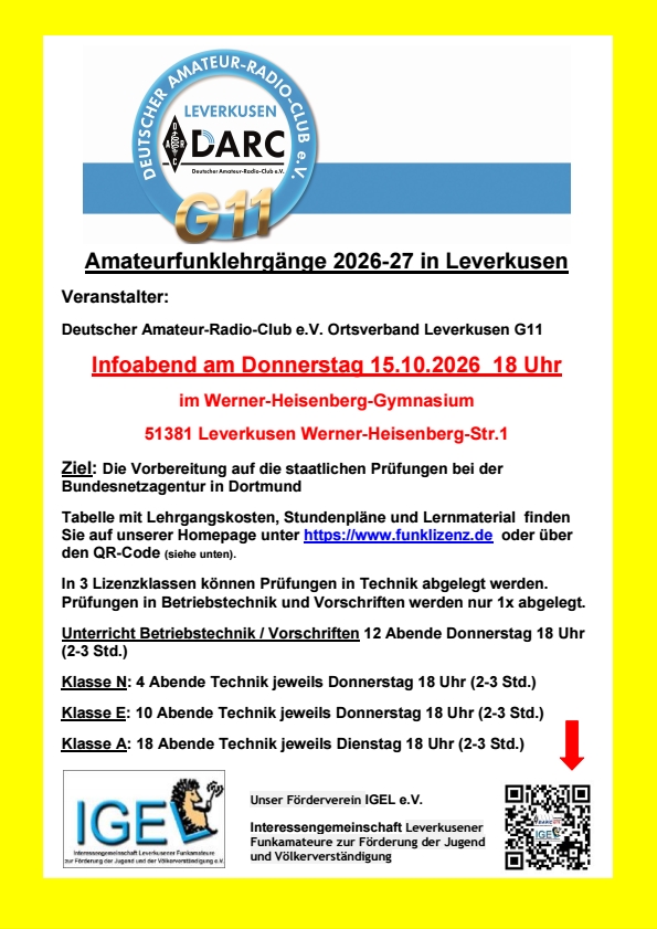 Herzlich willkommen auf den Seiten unserer Lizenzkurse Veranstalter der Kurse sind der Ortsverband G11 Leverkusen des Deutschen Amateur Radioclubs e.V. und die Interessengemeinschaft Leverkusener Funkamateure zur Förderung der Jugend und Völkerverständigung e. V. Neue Kurse für N, E und A ab November 2026 Info-Abend am 15.10.2026 18 Uhr im Werner-Heisenberg-Gymnasium in Leverkusen Unsere Kurse finden immer von Oktober bis Mai statt. Weit über 160 Funkamateure wurden bei uns ausgebildet. Unsere Unterrichtsmethode basiert auf der Lernplattform des DARC e.V. www.50ohm.de und den derzeit gültigen Fragenkatalogen der Bundesnetzagentur. Wir vermitteln das Wissen, um die staatliche Prüfung bei der Bundesnetzagentur zu bestehen. N und E-Lizenz immer donnerstags von 18 Uhr bis 20:15 Uhr A-Lizenz immer dienstags von 18 Uhr bis ca. 21 Uhr Gesamte Dauer ca. 6-7 Monate mit freiwilliger Prüfung bei der Bundesnetzagentur. Hier geht es zur Anmeldung |