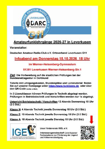 Herzlich willkommen auf den Seiten unserer Lizenzkurse Veranstalter der Kurse sind der Ortsverband G11 Leverkusen des Deutschen Amateur Radioclubs e.V. und die Interessengemeinschaft Leverkusener Funkamateure zur Förderung der Jugend und Völkerverständigung e. V. Neue Kurse für N, E und A ab November 2026 Info-Abend am 15.10.2026 18 Uhr im Werner-Heisenberg-Gymnasium in Leverkusen Unsere Kurse finden immer von Oktober bis Mai statt. Weit über 160 Funkamateure wurden bei uns ausgebildet. Unsere Unterrichtsmethode basiert auf der Lernplattform des DARC e.V. www.50ohm.de und den derzeit gültigen Fragenkatalogen der Bundesnetzagentur. Wir vermitteln das Wissen, um die staatliche Prüfung bei der Bundesnetzagentur zu bestehen. N und E-Lizenz immer donnerstags von 18 Uhr bis 20:15 Uhr A-Lizenz immer dienstags von 18 Uhr bis ca. 21 Uhr Gesamte Dauer ca. 6-7 Monate mit freiwilliger Prüfung bei der Bundesnetzagentur. Hier geht es zur Anmeldung |