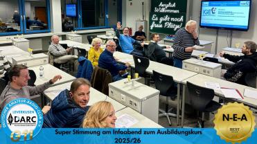Herzlich willkommen auf den Seiten unserer Lizenzkurse Veranstalter der Kurse sind der Ortsverband G11 Leverkusen des Deutschen Amateur Radioclubs e.V. und die Interessengemeinschaft Leverkusener Funkamateure zur Förderung der Jugend und Völkerverständigung e. V. Neue Kurse für N, E und A ab November 2025 im Werner-Heisenberg-Gymnasium in Leverkusen Unsere Kurse finden immer von Oktober bis Mai statt. Weit über 160 Funkamateure wurden bei uns ausgebildet. Unsere Unterrichtsmethode basiert auf der Lernplattform des DARC e.V. www.50ohm.de und den derzeit gültigen Fragenkatalogen der Bundesnetzagentur. Wir vermitteln das Wissen, um die staatliche Prüfung bei der Bundesnetzagentur zu bestehen. N und E-Lizenz immer donnerstags von 18 Uhr bis 20:15 Uhr A-Lizenz immer dienstags von 18 Uhr bis ca. 21 Uhr Gesamte Dauer ca. 6-7 Monate mit freiwilliger Prüfung bei der Bundesnetzagentur. Hier geht es zur Anmeldung |